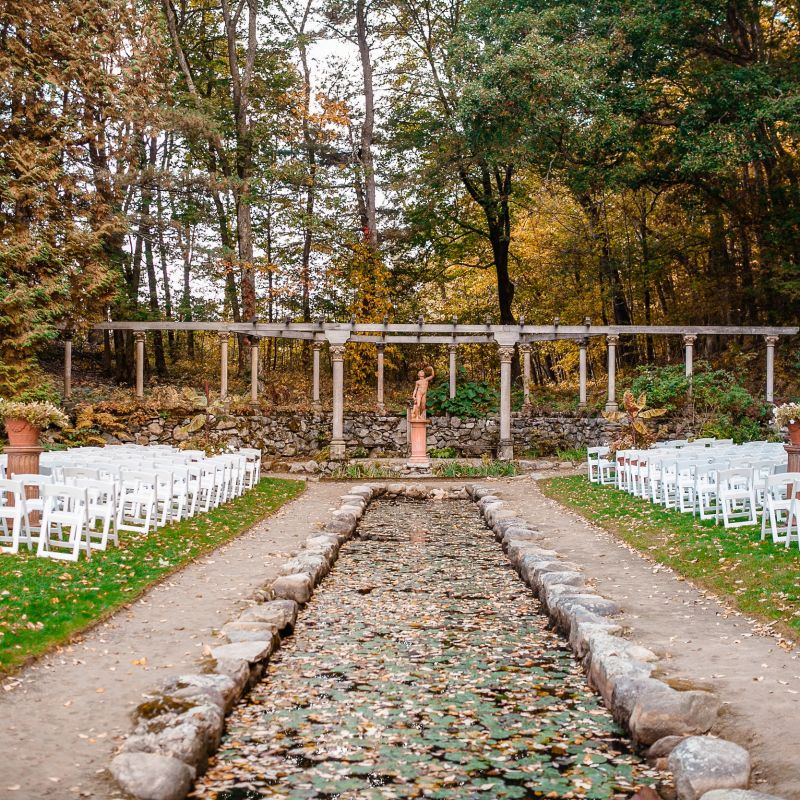 The Codman Estate Carriage House has been renovated especially for private parties and functions. With its rich wood paneling and rustic ambiance, it provides a casually elegant and affordable option for your special day. A highlight of the landscape is the Italian Garden. This surprisingly formal secret garden features a marble-columned pergola covered with flowering vines, and is a perfect location for wedding ceremonies. Guests sit alongside a reflecting pool surrounded by flowers, classical urns, and statuary. An English country garden, originally designed and tended by Dorothy Codman, offers a beautiful but less formal setting for photographs.